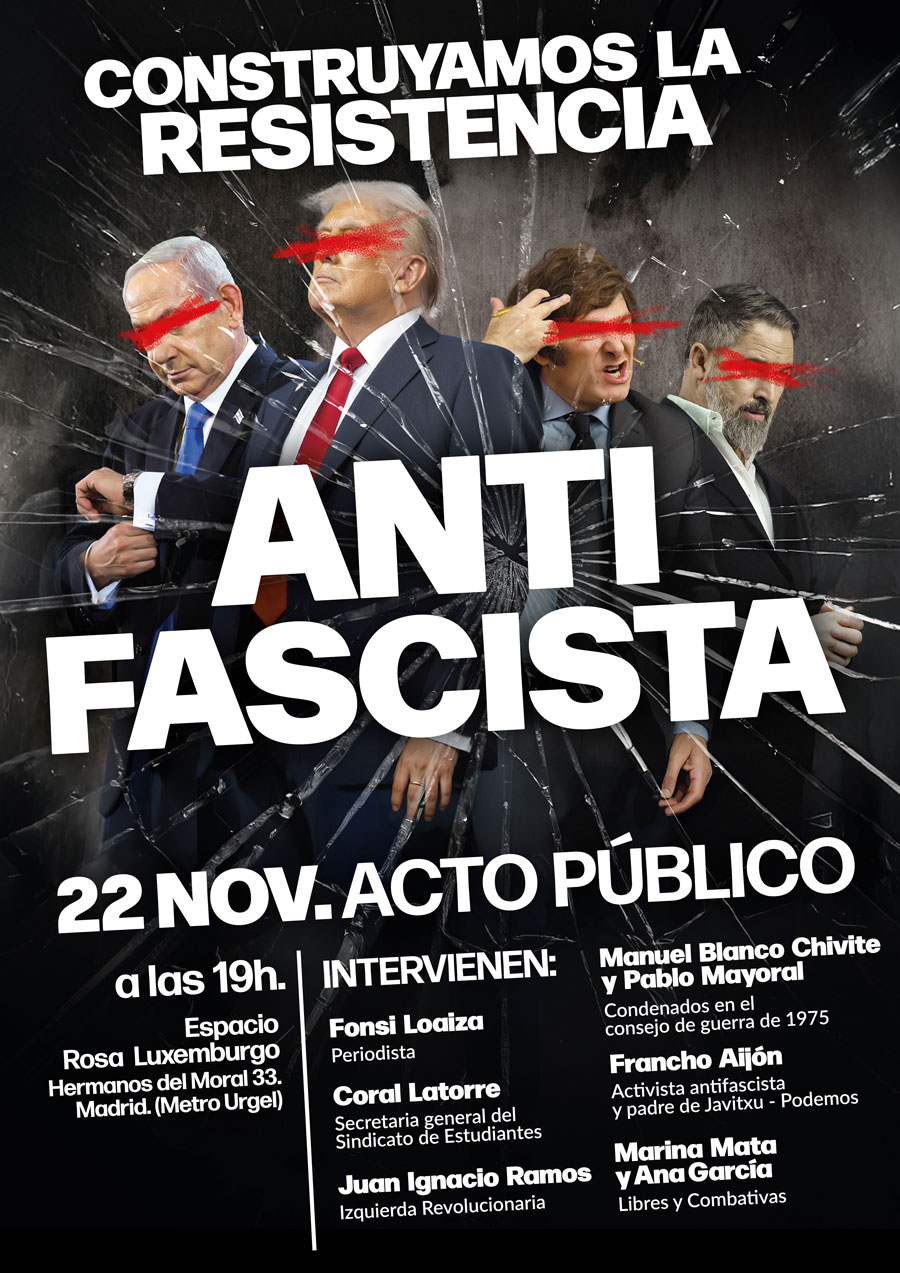 Para debatir sobre todo esto e impulsar la resistencia antifascista con un contenido de clase y revolucionario, os invitamos a todas y a todos a participar en el gran acto público que celebraremos el sábado 22 de noviembre a las 19h en el Espacio Rosa Luxemburgo (Calle Hermanos del Moral 33 - Metro Urgel).